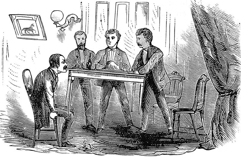 An illustration from A Bid for Fortune by Guy Newell Boothby (1895). The caption reads: "The black cat looked through the smoke at the three men."