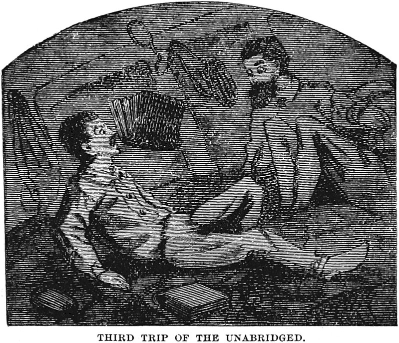 "Third trip of the unabridged [dictionary, pictured flying through the air]," from Roughing It by Mark Twain.
