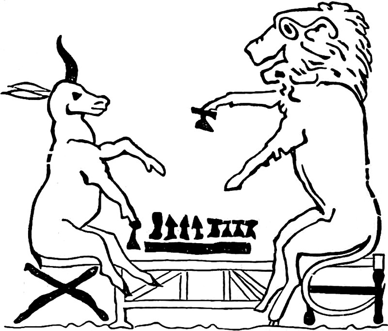 An illustration by A. Layard from The Marvellous Adventures of Sir John Maundevile (1895). The caption reads: "The boar-headed bear-bodied lion-tailed 6-legged beast."