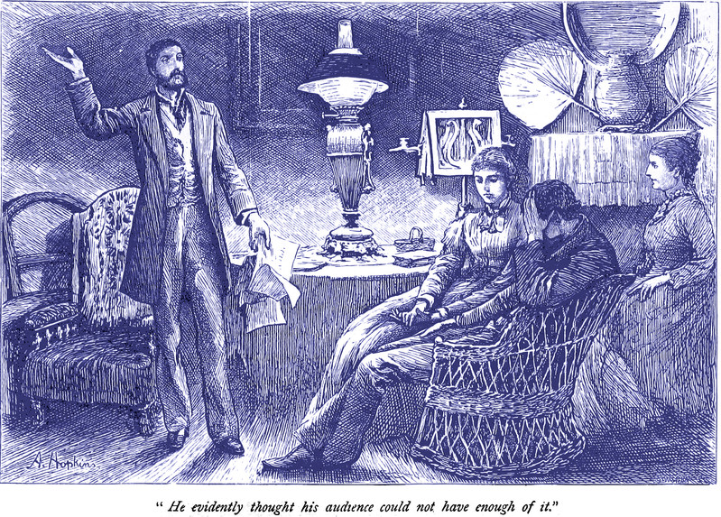 "He evidently thought his audience could not have enough of it," from Miss Misanthrope by Justin MacCarthy and illustrated by Arthur Hopkins, 1878.