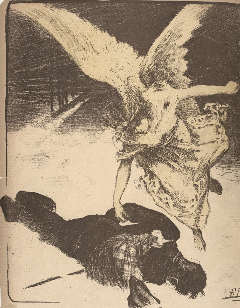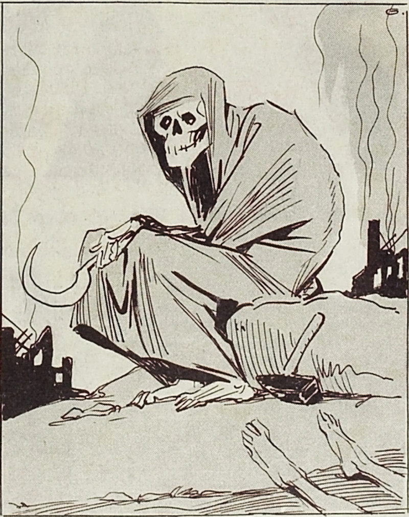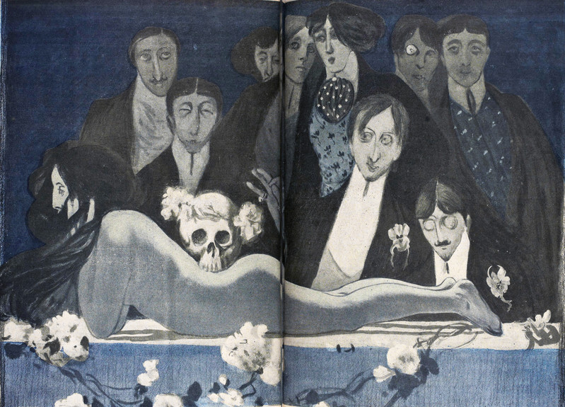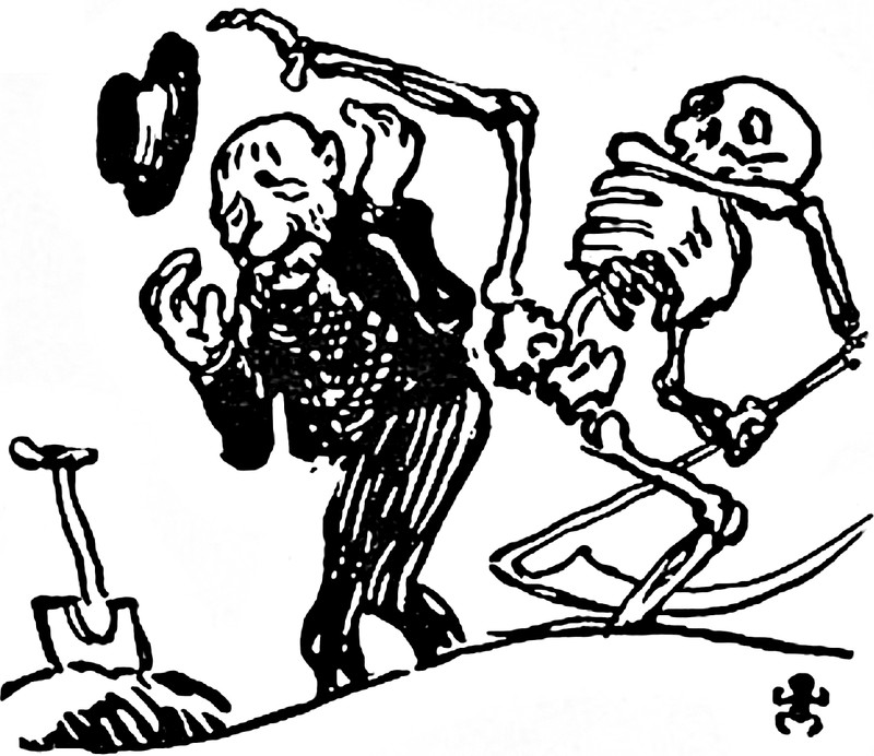 Fighting off the grim reaper with an umbrella. From Satirikon, 1908.