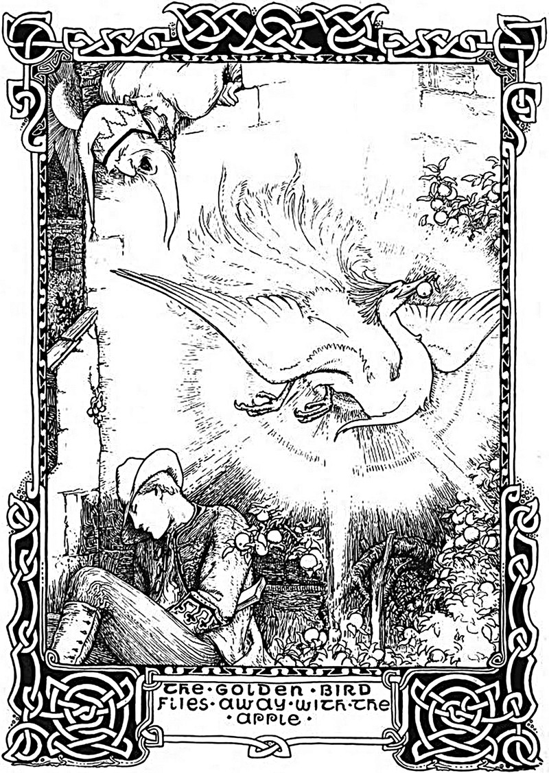 The golden bird flies away with the apple. From More Celtic Fairy Tales by Joseph Jacobs and illustrated by John D. Batten, 1894.