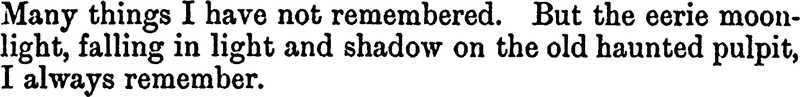 "Many things I have not remembered. But the eerie moonlight, falling in light and shadow on the old haunted pulpit, I always remember." From Upper Annandale by Agnes Marchbank, 1901.