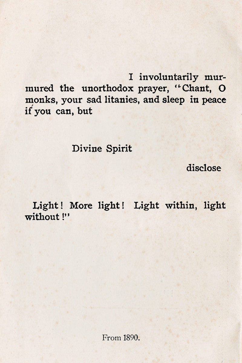 If you happen to see a church tower, wonder whether the religions of the world are "nothing but so many creaking and splashing barges," whereon the souls of humanity ferry themselves over "lakes of primal silence," disturbing the swaying water lilies that grow there and frightening away the timid waterfowl.