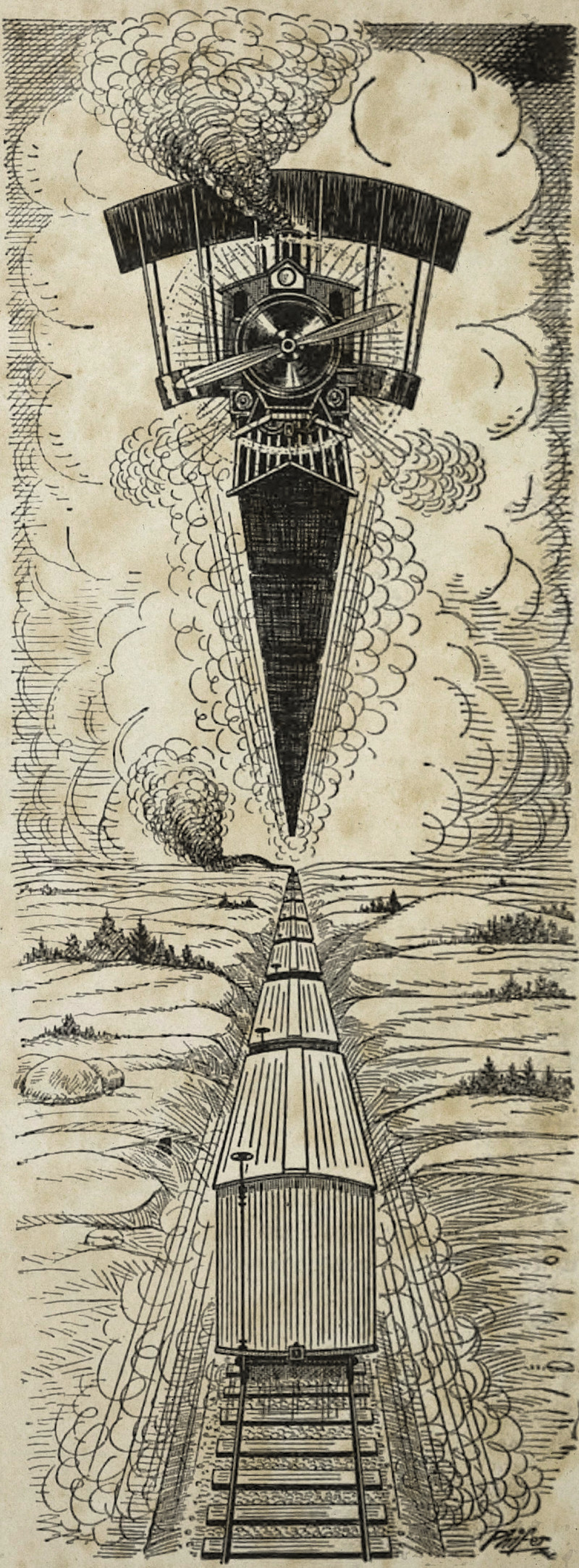 A flying train. From The Judge, 1920.