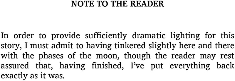 An apology for tinkering with the phases of the moon so as to provide sufficiently dramatic lighting for the story. From (the very charming, in the style of golden age British mysteries) A Red Herring Without Mustard by Alan Bradley, 2011.