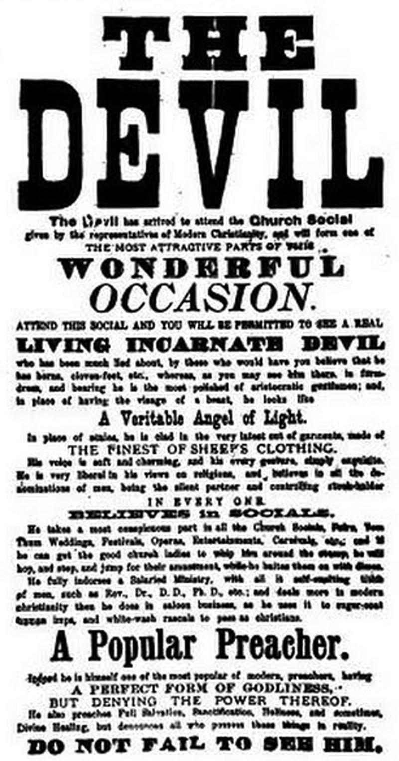 Indeed he is himself one of the most popular of modern preachers, having a perfect form of godliness, but denying the power thereof. He also preaches full salvation, sanctification, holiness, and sometimes divine healing, but denounces all who possess these things in reality. Do not fail to see him.