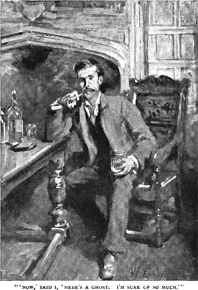 An illustration from a 1905 issue of Wide World magazine. The caption reads: "'Now,' said I, 'Here's a ghost. I'm sure of so much.'"