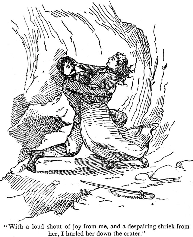An illustration from The Sphinx-like Head by J. Harry Sugden (1896). The caption reads: "With a loud shout of joy from me, and a despairing shriek from her, I hurled her down the crater."