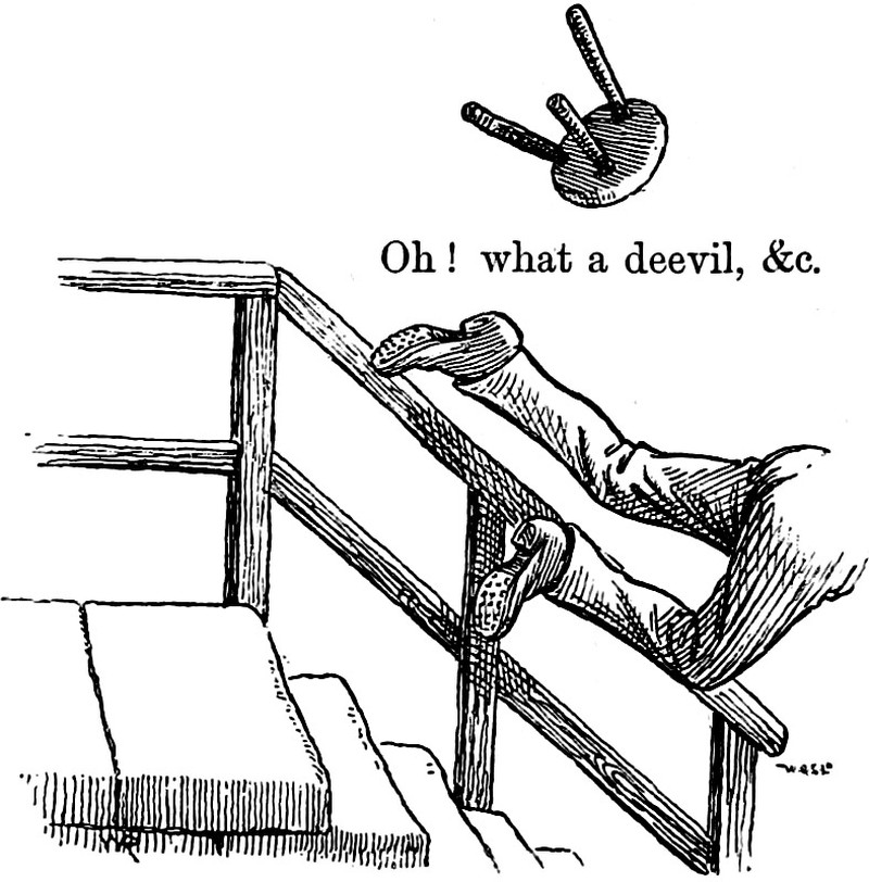 An illustration from Legal and Other Lyrics by George Outram (1887). The caption reads: "Oh! what a deevil, &c."