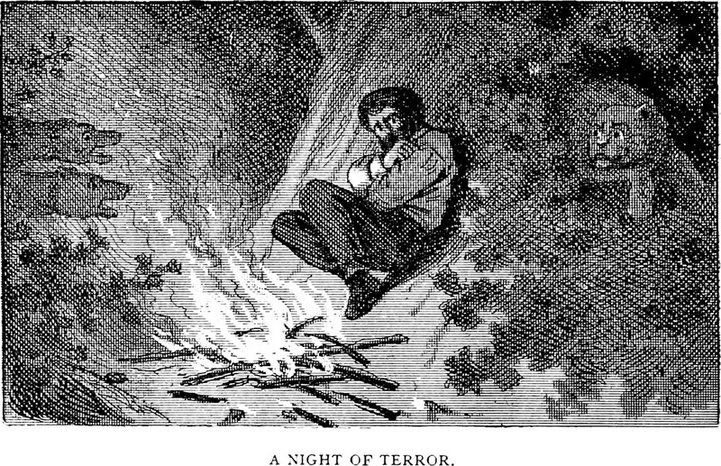 An illustration from Echoes from the Rocky Mountains by John Clampitt (1889). The caption reads: "A night of terror."