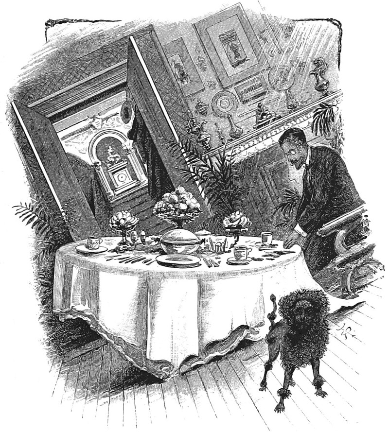 An illustration from A Fatal Fiddle by Edward Heron Allen (1890). The caption reads: "He had seen the hand on the former occasion—there it was—wandering from shelf to shelf."