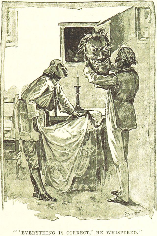 An illustration from The White Man's Foot by Grant Allen and illustrated by Joseph Finnemore (1888). The caption reads: "'Everything is correct,' he whispered."