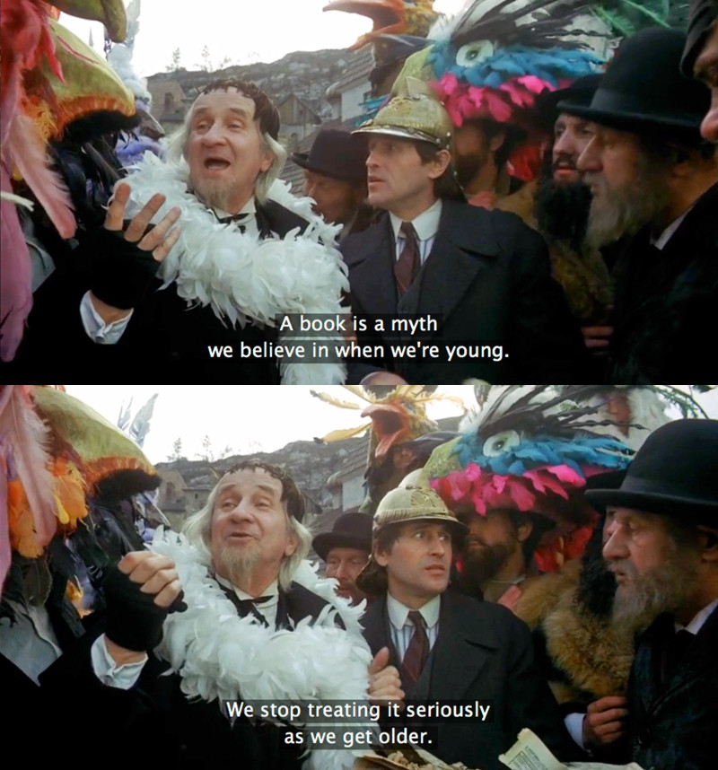 "A book is a myth we believe in when we're young. We stop treating it seriously as we get older." — The Hourglass Sanatorium (1973, Poland)