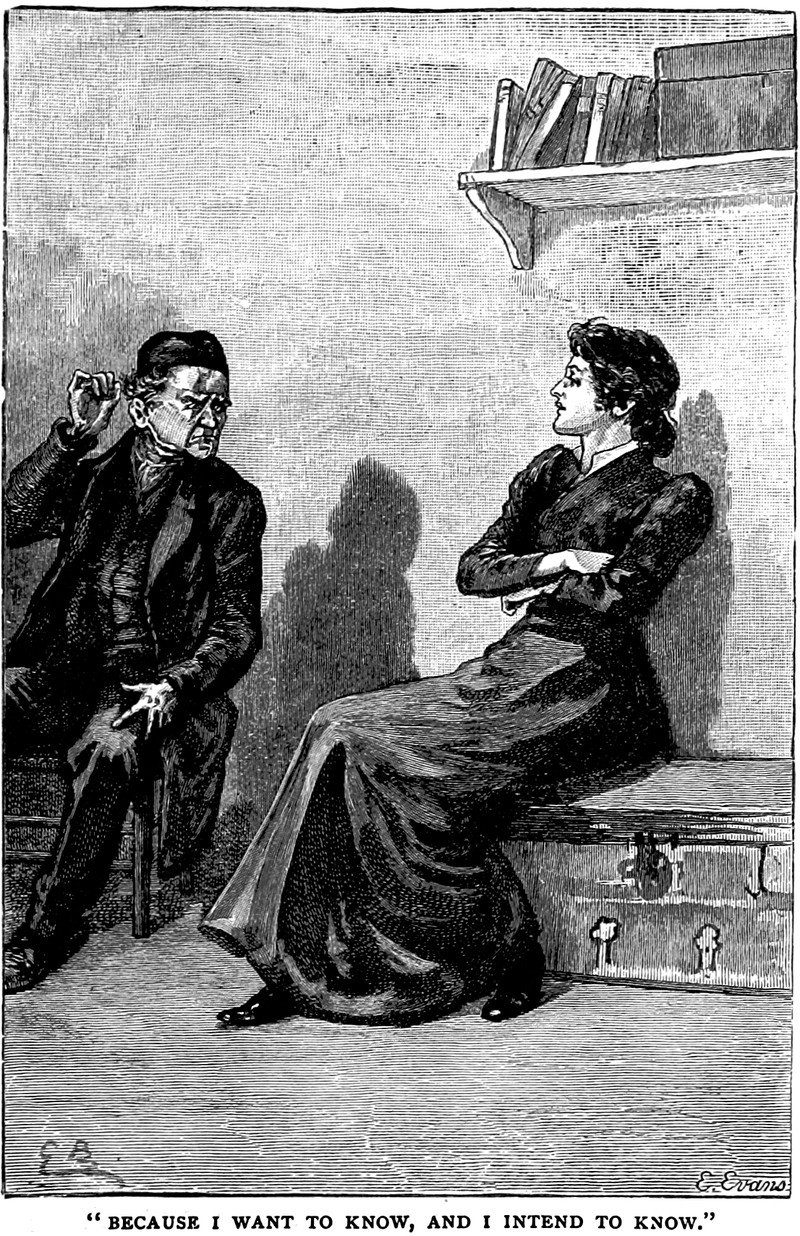 An illustration from Helen by Maria Edgeworth, (1896). The caption reads: "Her expertness at general answers which give no information completely baffled the two."