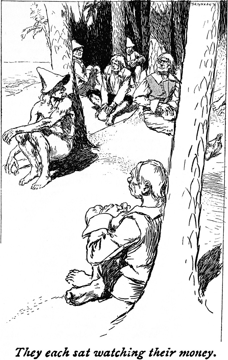 "They each sat watching their money." From The Phantom Ship by Frederick Marryat and illustrated by H. R. Millar, 1896.