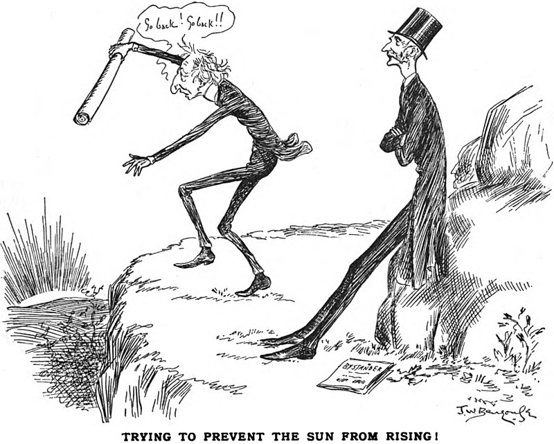 "Trying to prevent the sun from rising," from Grip, 1890.