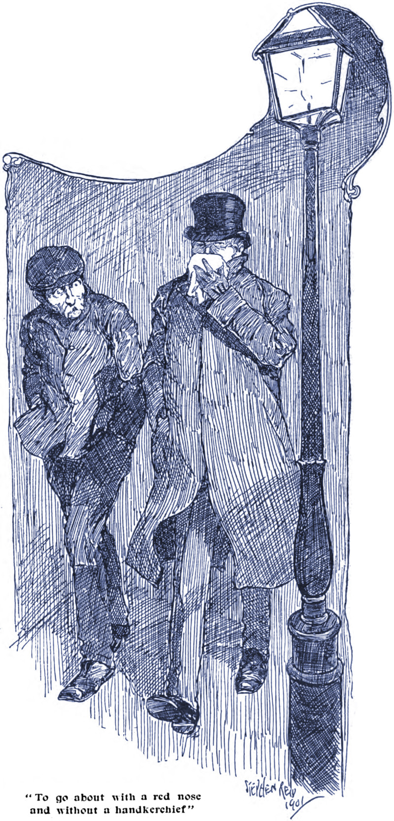 "To go about with a red nose and without a handkerchief," from Black and White Budget, 1901.