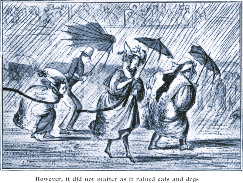 "However, it did not matter as it rained cats and dogs." From Black and White Budget, 1902.