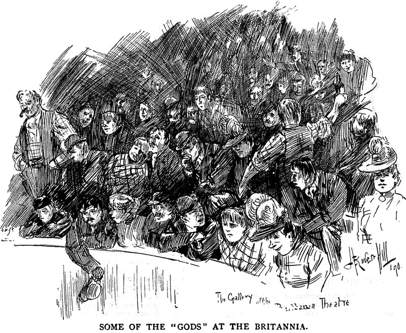 "Some of the 'gods' at the [gallery of] the Britannia [theatre]." From Pick Me Up, 1891.
