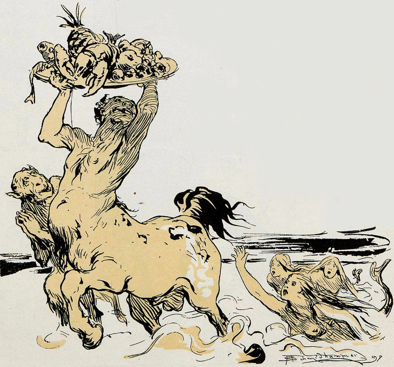 A mermaid party platter stolen by a centaur. From Jugend, 1897.