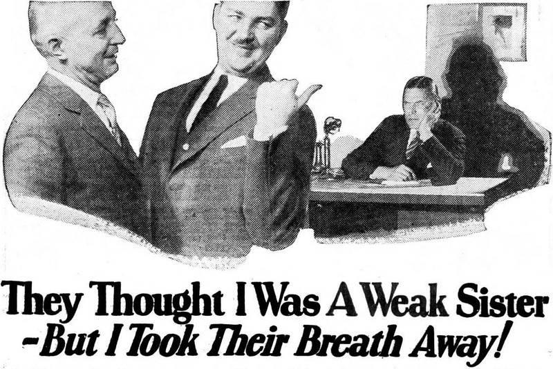 "They thought I was a weak sister— but I took their breath away!" From Popular Mechanics, 1927.