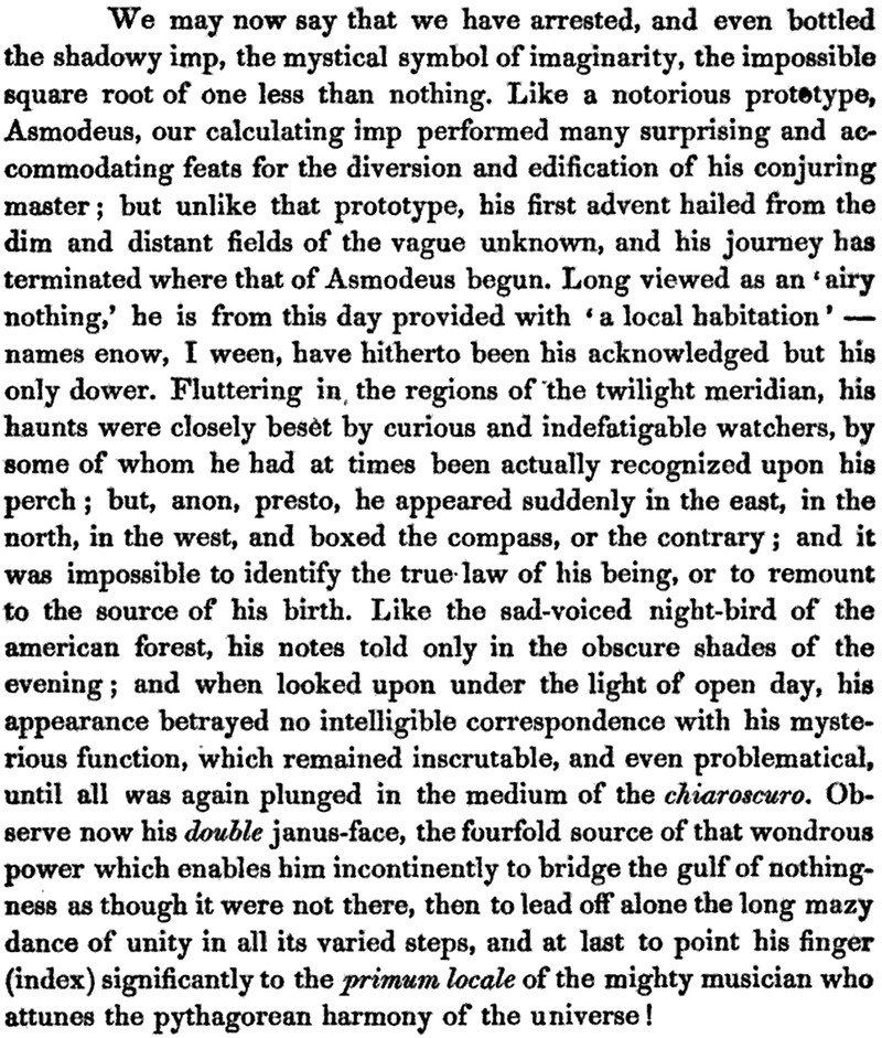 We found the very day in which the square root of negative one was captured in an imp bottle. From the Proceedings of the American Association for the Advance of Science, 1851. Since the advent of the New Inquisition, no scientific paper could be written like this, from the mention of the "shadowy imp" in the first sentence to the "mighty musician who attunes the pythagorean harmony of the universe" in the last.