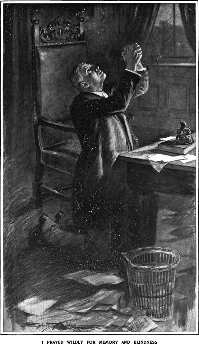 An illustration from a 1904 issue of Harper's magazine. The caption reads: "I prayed wildly for memory and blindness." See Strange Prayers for Strange Times.