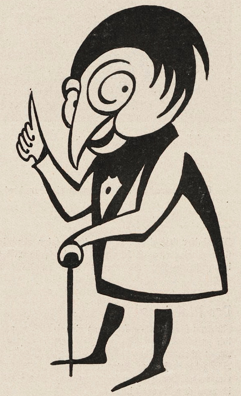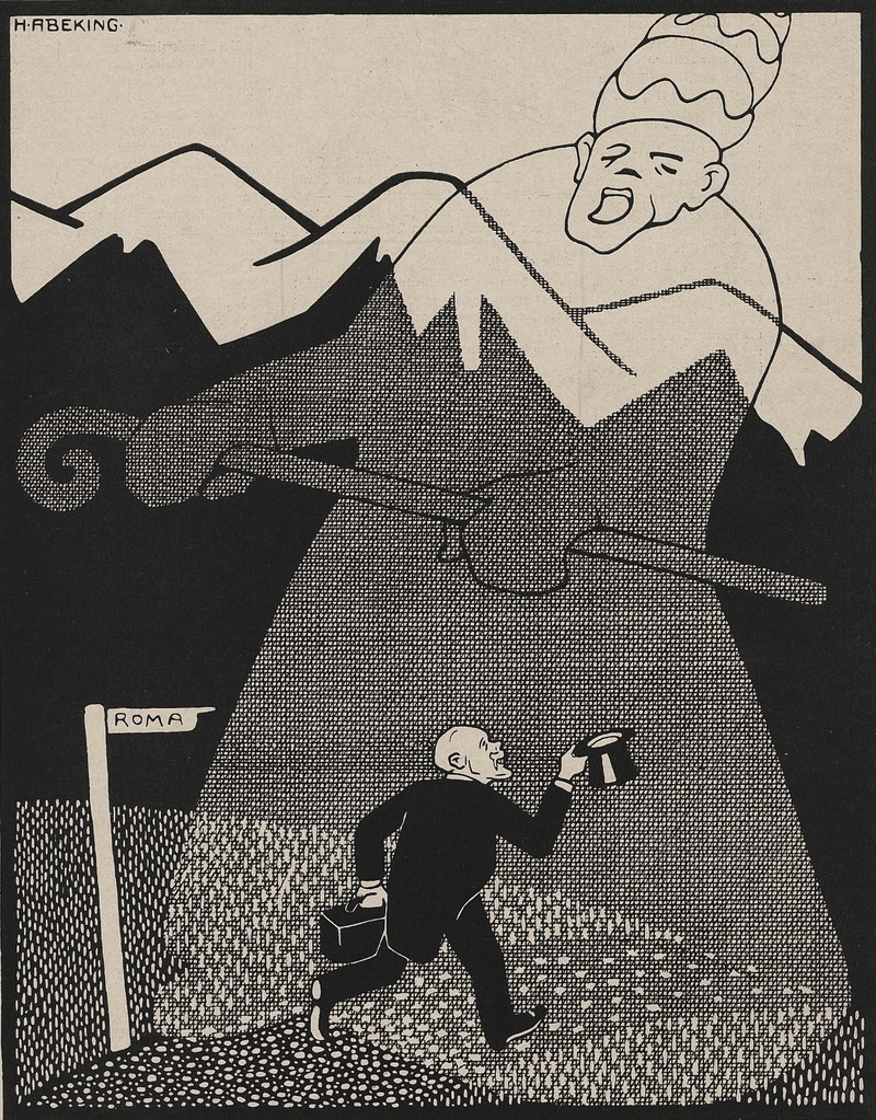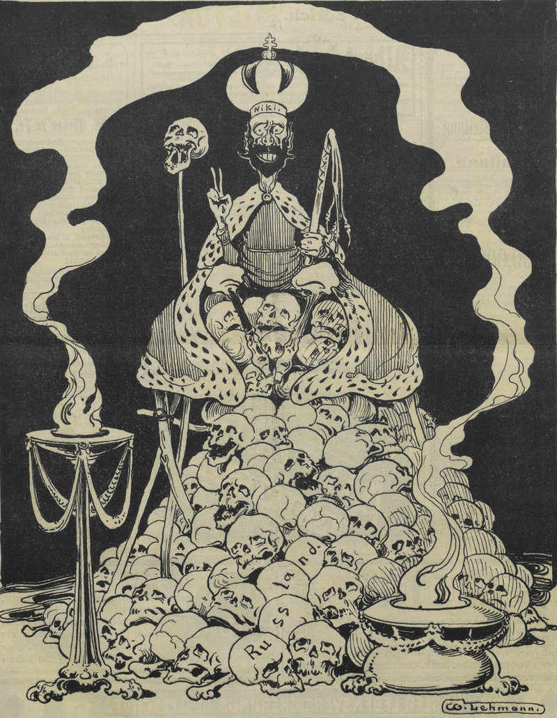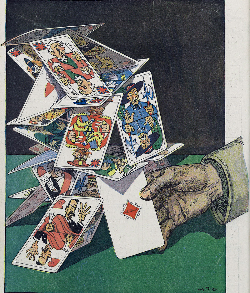 From Nebelspalter, 1914. The figure at the bottom, tipping his hat at a trail of injured bodies, recalls the evil detective Hercule Poirot. As we said back in 2012: