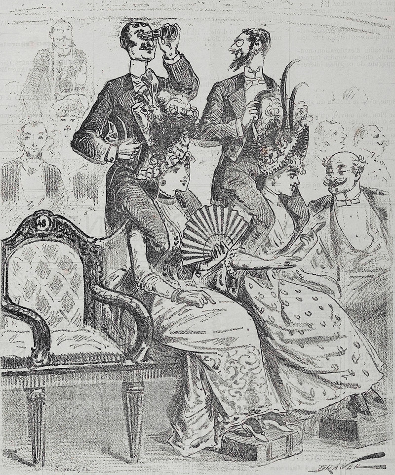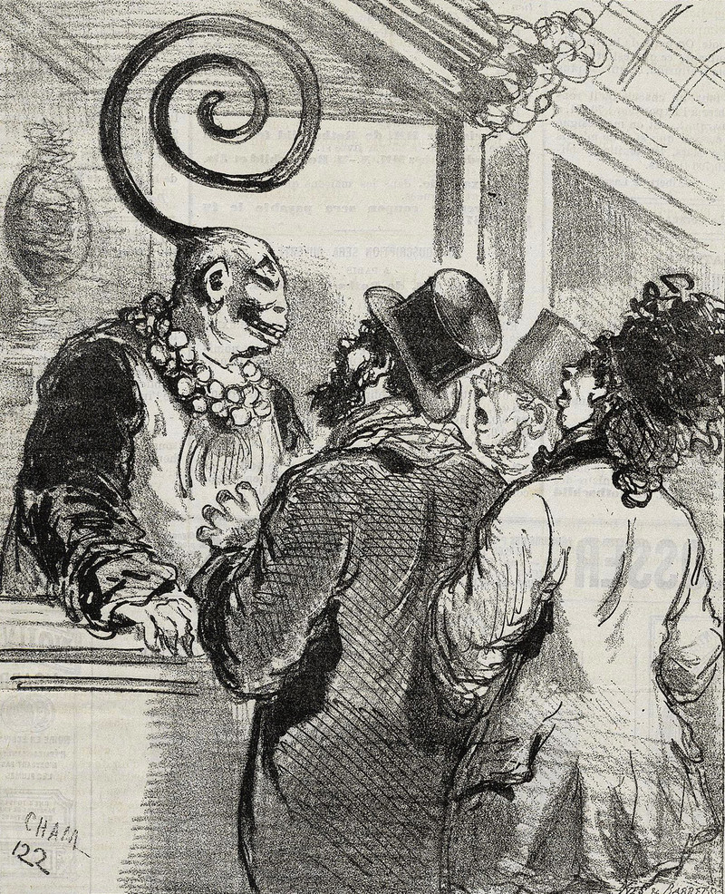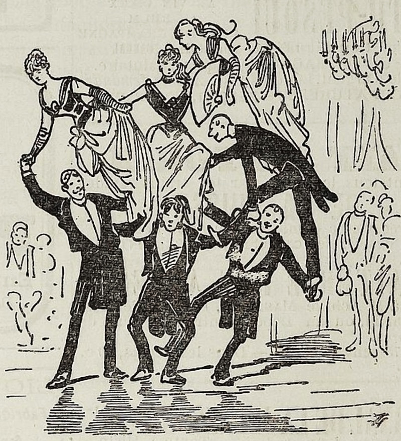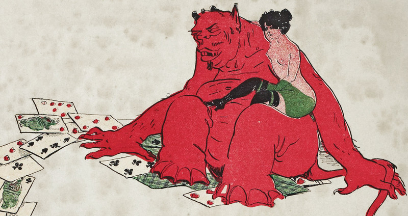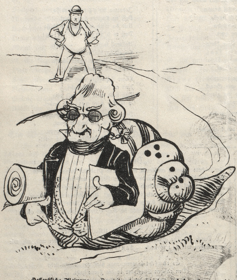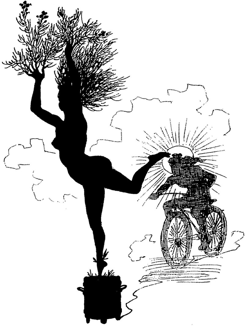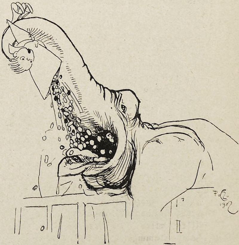 This is the most chaste Eve we've encountered not wearing a fig leaf. Meanwhile, Adam's fig leaf skirt is rather rare in the Eden fashion line. From Nebelspalter, 1905.
