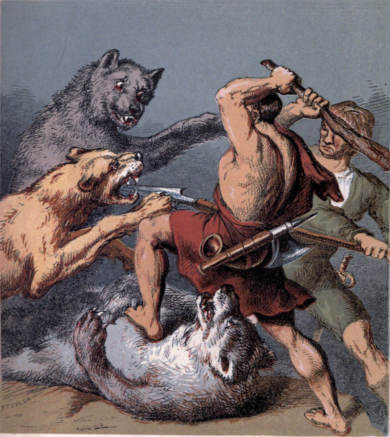 Runestone in Bröta in Grödinge, also called "The Bröta stone." The inscription says: "Vígmar had this stone raised in memory of Jörunde, his kinsman and companion and ---'s brother." Wash drawing by Richard Dybeck, from the 1850s. Courtesy of Swedish National Heritage.