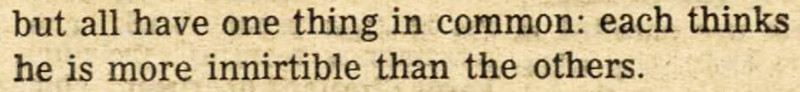 To this day, the word "innirtible" is a Googlewhack. Thinking oneself more innirtible than anyone else, the article suggests, is a trait shared by all college men. From The Current Sauce, 1956.