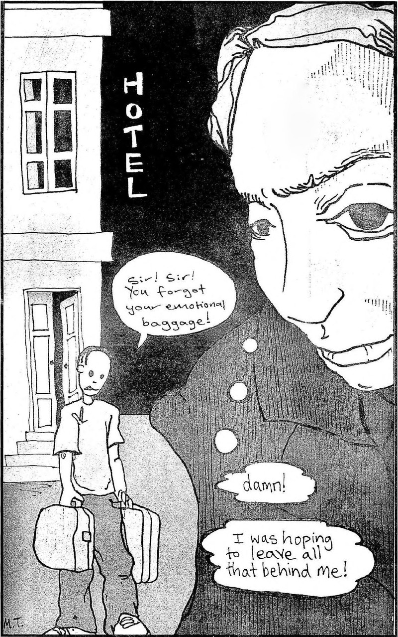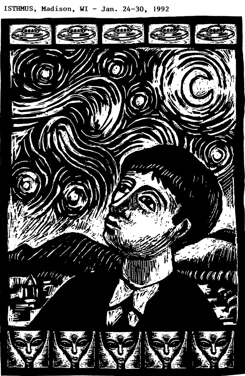 A world emerging from a head within the blue egg of a pupil, as the face in the universe looks on. This sort of thing is why we prefer people to wear sunglasses. From Taylor's 1989 yearbook.