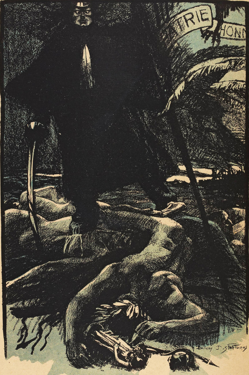 "Scythes are not being worn" this season. How to trick the grim reaper, from Caricature, the Wit & Humor of a Nation In Picture, Song and Story, 1914.