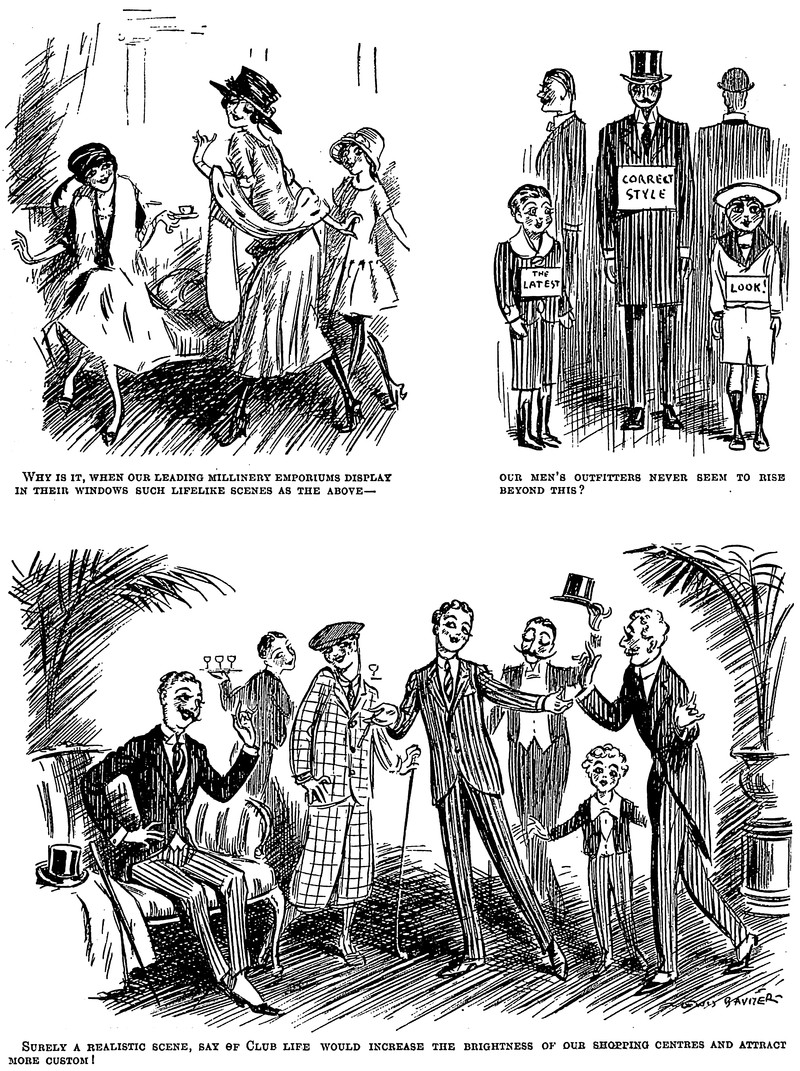 A call for male mannequins to strike gayer poses. From Punch, 1922.