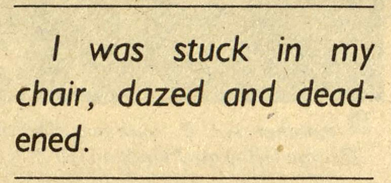 "I was stuck in my chair, dazed and deadened." From Bay Area Reporter, 1982.