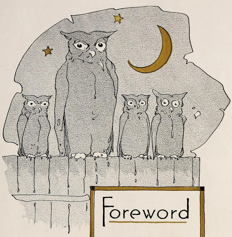 An owl with a peacock feather. From the University of Pittsburgh's 1918 yearbook.