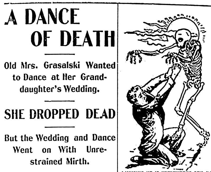 Dropped dead, but the dance went on with unrestrained mirth. From the Duluth Evening Herald, 1898.