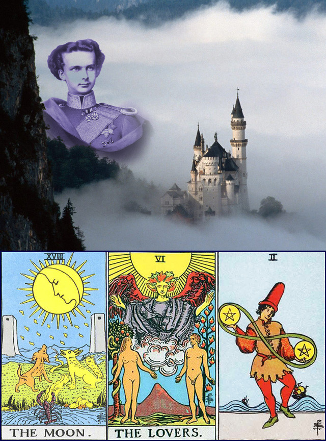 The moon faces left; the juggler of coins faces right; the lovers in the middle don't touch. We see an unmistakable polarity in this spread of cards. Is it evidence of a strong Anima/Animus personality or of mental instability? Ludwig's enemies saw imbecilic dancing in the juggler and heard mad howling from the moonlit wolves. They declared the king insane and deposed him in 1886.
