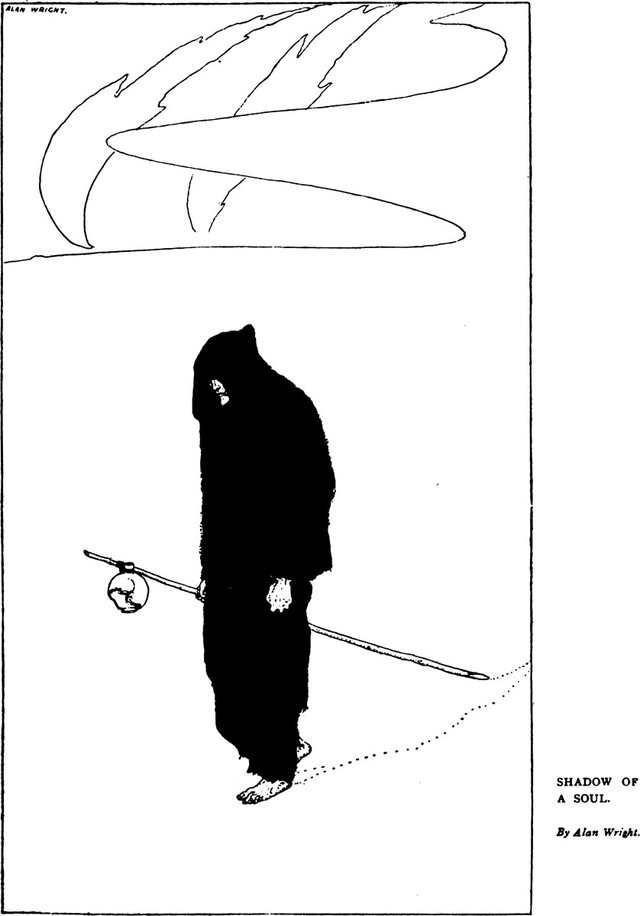 An illustration by Pamela Colman Smith from a 1903 issue of The Reader magazine. The caption reads: "Led on by courage and death with sorrow at his feet."