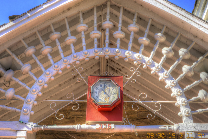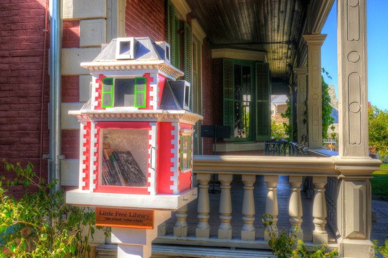 We encountered and determined the cause of a temporal anomaly in the mountain town of Trinidad, Colorado. A clock on a funeral parlor displays an incorrect time (four hours early, plus the shadows of the clock's hands depict a bonus time five minutes later). As constant investigators of such phenomena, we saw the source of the problem with a mere turn of the head. Directly across the street is an historic gothic house, the Bloom Mansion. That haunted relic from 1882 is the cause of the funerary clock's error, the effect compounded by the existence of a mini version of the mansion in the form of a Little Free Library (boosting the disruptive signal, as it were, from the macrocosm into the microcosm). Though the cause is simple enough, great mysteries yet abound, for does a fourth-story widow's walk have the power to disrupt the flow of time? By the way, as we walked toward the Bloom Mansion on the day of our investigation, our progress was delayed by an improbably long funeral procession that passed in front of us. As plutocrats of the supernatural, we expected nothing less.