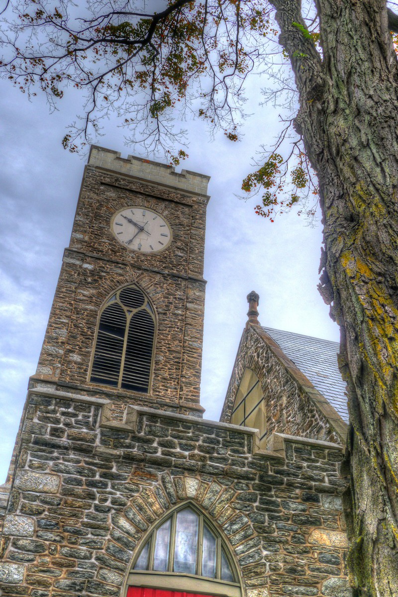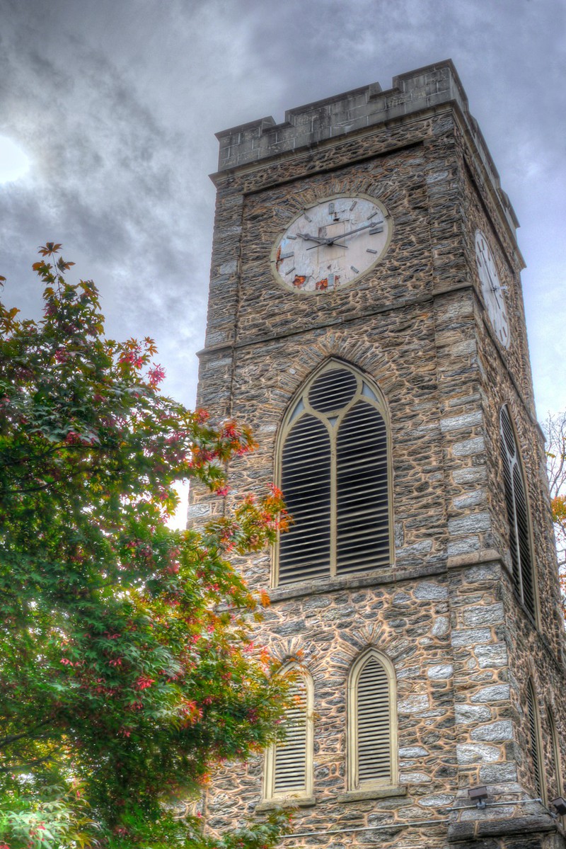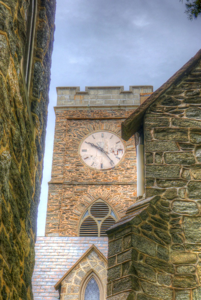 We encountered a temporal anomaly in the city of brotherly love, Philadelphia, Pennsylvania. All four sides of the clock tower at St. Paul's Episcopal in Elkins Park told a different, frozen time. As constant investigators of such phenomena, we carefully searched the church grounds for the source of the problem, sidestepping slippery acorns and dodging a fallen electrical wire by the graveyard. The entire property is frankly decrepit, with the cemetery unkempt and the overall impression being one of abandonment. As historic preservationists ourselves, the state of this 163-year-old church was painful, to put it mildly. With so much disorder, it was difficult to pinpoint a specific cause for the temporal anomaly, so we looked within the name of the church itself. "St. Paul's Episcopal" is an anagram of "as collapses tip up." You will no doubt recognize that last phrase as a twist on the great Hermetic axiom, "as above, so below." The collapsing physical structure of the church, having slowly fallen into decrepitude over time, is reflected above, in the clock tower. "It is time for Episcopalians across the country to rise up" (Ruy O. Costa).