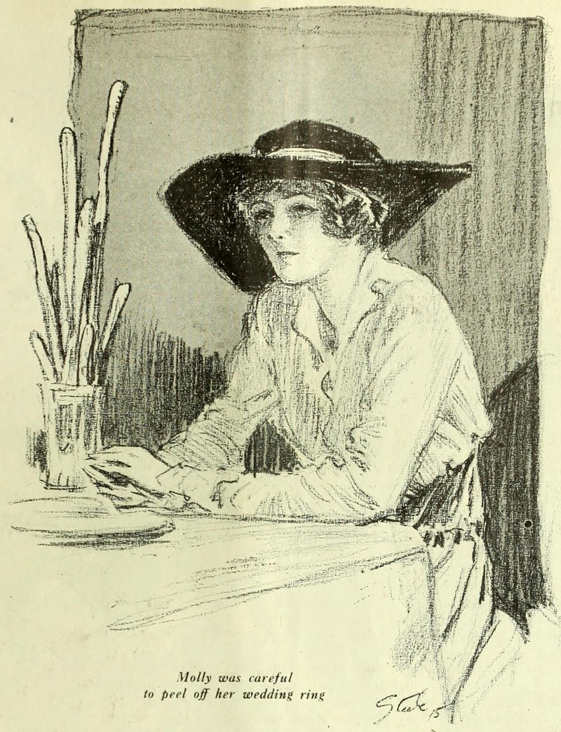"Molly was careful to peel off her wedding ring."  From Collier's, 1915.  See The Collected Lost Meanings of Wedlock.