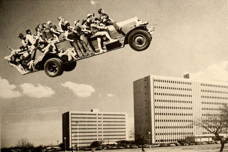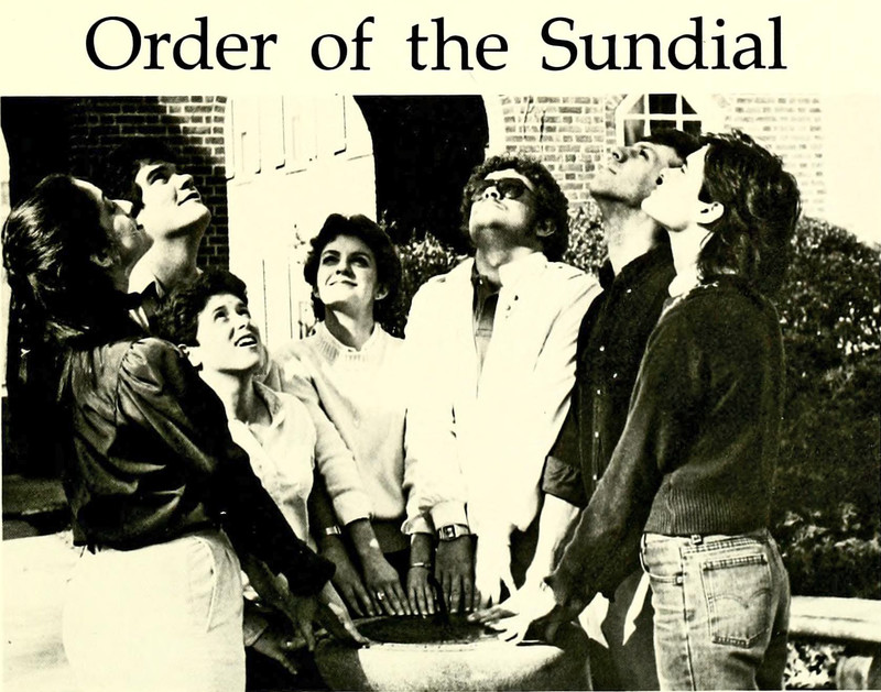 All seven of them are looking the wrong way. It's the shadow on the sundial that tells the time, you poor misguided fools. Ah, bless. From Pfeiffer's 1983 yearbook.