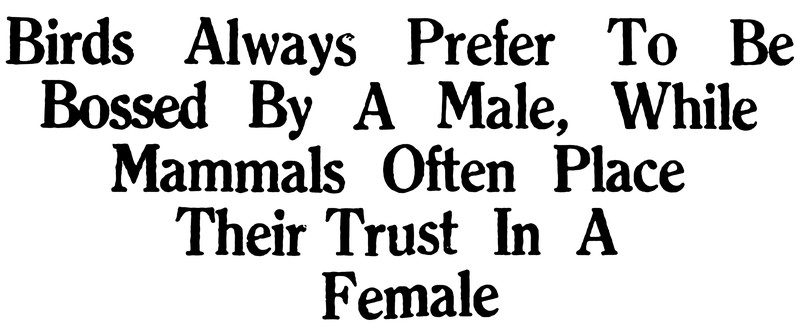 "Birds always prefer to be bossed by a male, while mammals often place their trust in a female." From the Bombay Sunday Chronicle, 1938.