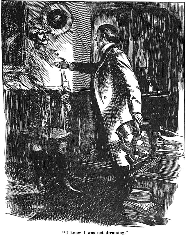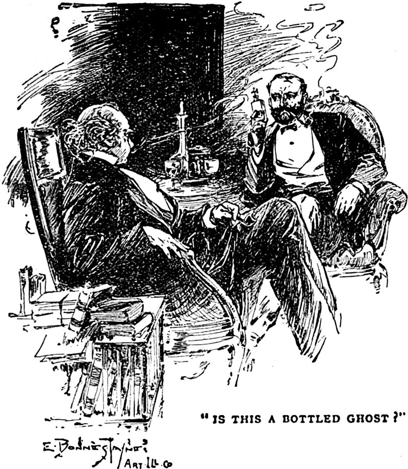 An illustration from an 1894 issue of The Idler magazine. The caption reads: "Is this a bottled ghost?"