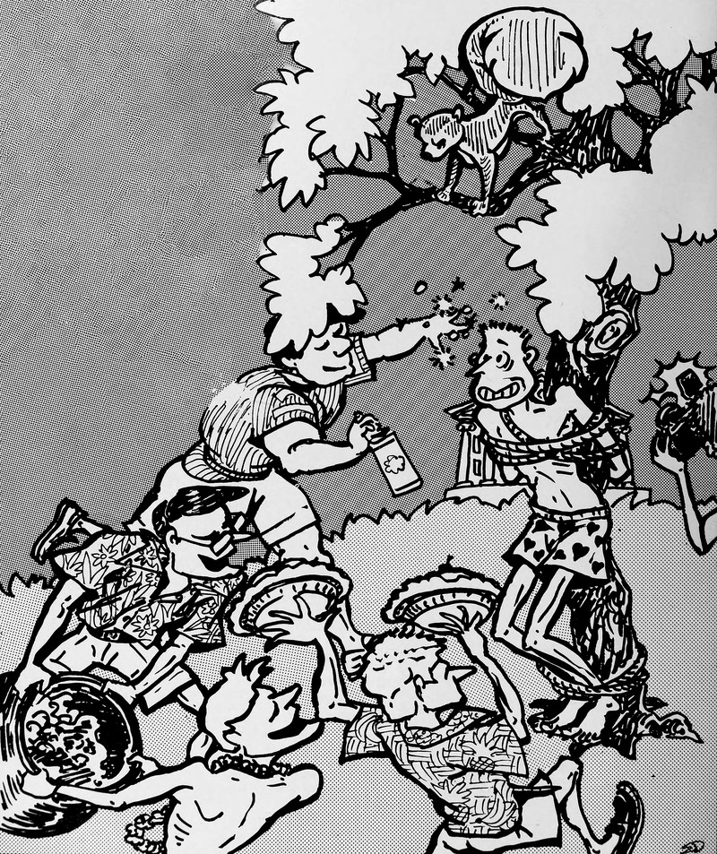 #vintage illustration #vintage yearbook #yearbook #hazing #tied to a tree #illustration #1980s #pie in the face