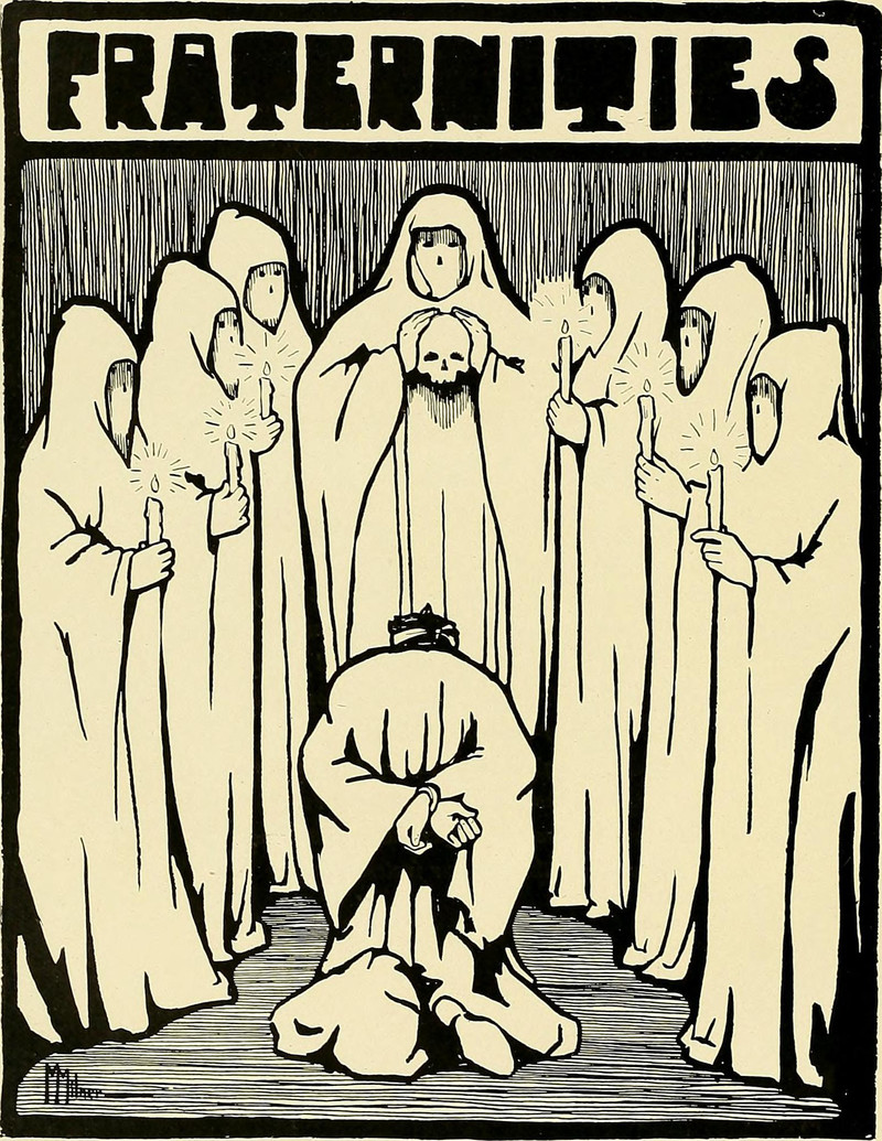 #vintage illustration #fraternity #vintage yearbook #yearbook #1920s #hooded figure #in chains