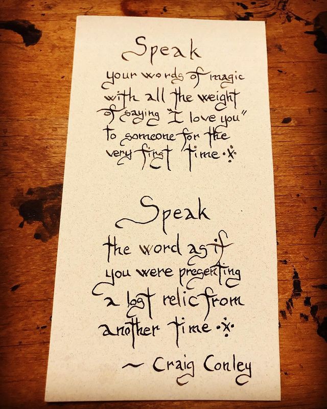 We're honored that Cyril the Sorcerer calligraphized two lines of ours about speaking magic words: "Speak your words of magic with all the weight of saying 'I love you' to someone for the very first time. ... Speak the word as if you were presenting a lost relic from another time." Cyril added, " Thanks Prof. Oddfellow aka Craig Conley for your artistry with ink, words and magic."