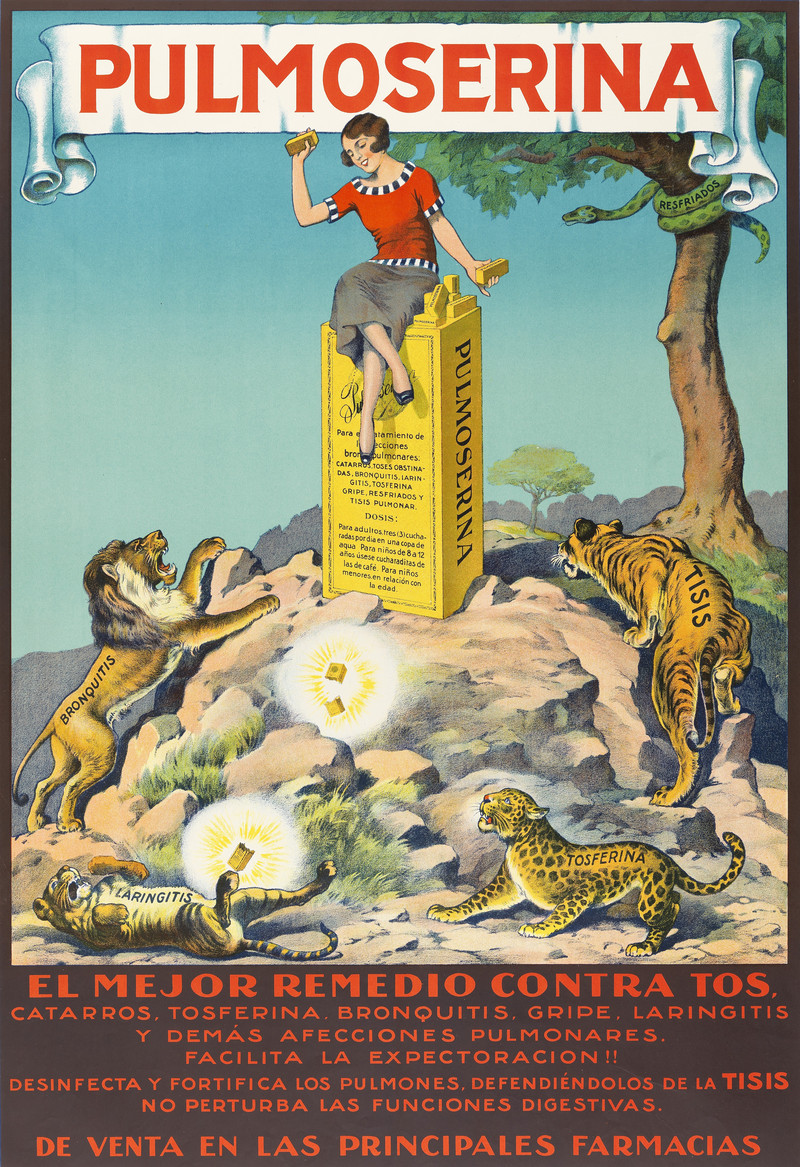 "Booklet advertising Peps tablets for coughs and colds. Sensational cover (orange and blue) of a skull-faced Death in a swirling dark cloud over a city from which terrified inhabitants are fleeing on foot, in cars, bicycles and horse-drawn carriages. Refers to deaths during heavy fogs in cities, bronchial asthma, bronchitis, colds, cough, sore throat, pulmonary tuberculosis, influenza, pleurisy, pneumonia and factory cough." From 1913.